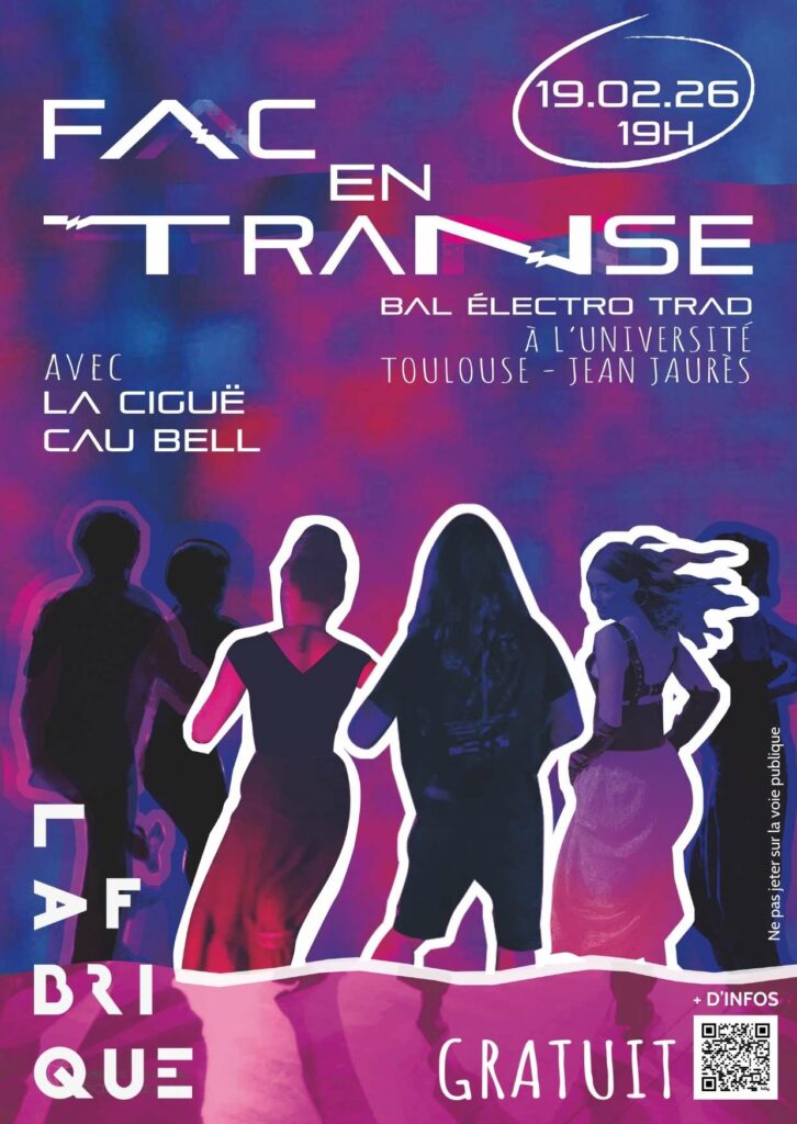 Première édition à La Fabrique des soirées Fac en Transe, événement où la musique nous emmène dans une transe collective et festive. Pour 2026, cap sur la musique néo-trad avec les groupes Cau Bell et La Ciguë. Entrez vite dans la danse d’un bal électro-trad survitaminé ! Que l’on soit danseur·se confirmé·e ou simple curieux·se, ce bal est pensé comme un moment de rencontres, de transmission et de partage, dans une ambiance conviviale et inclusive.
