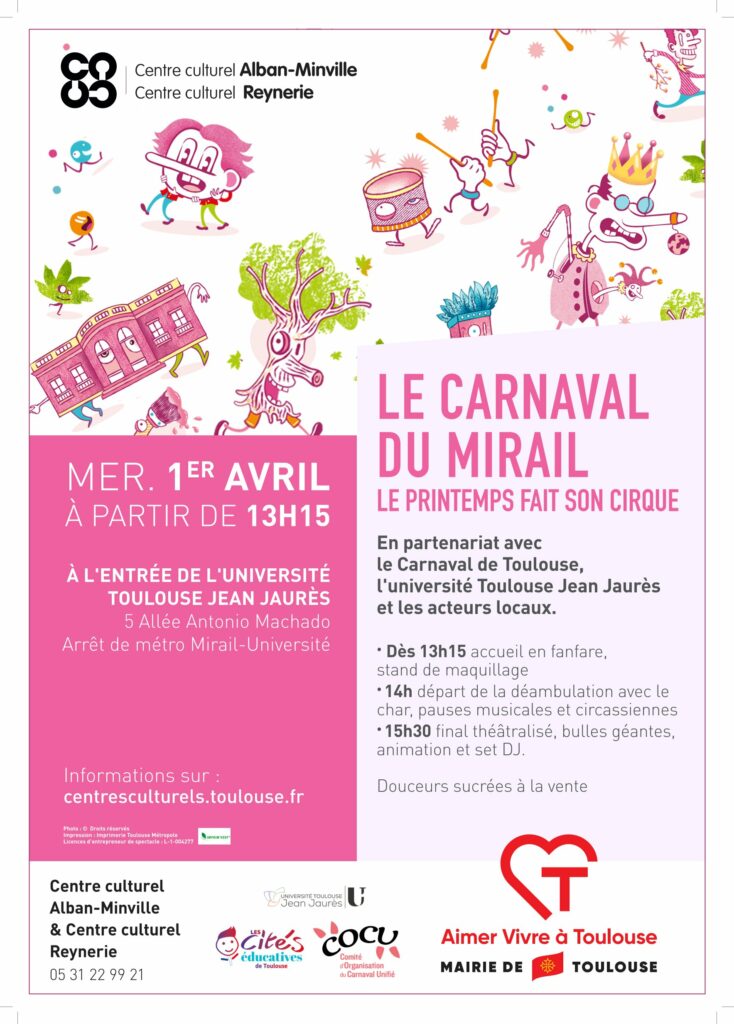 Venez nombreux le 1er avril, à partir de 13h15, participer à ce Carnaval inter-quartiers du Mirail. Déguisements et maquillages attendus !