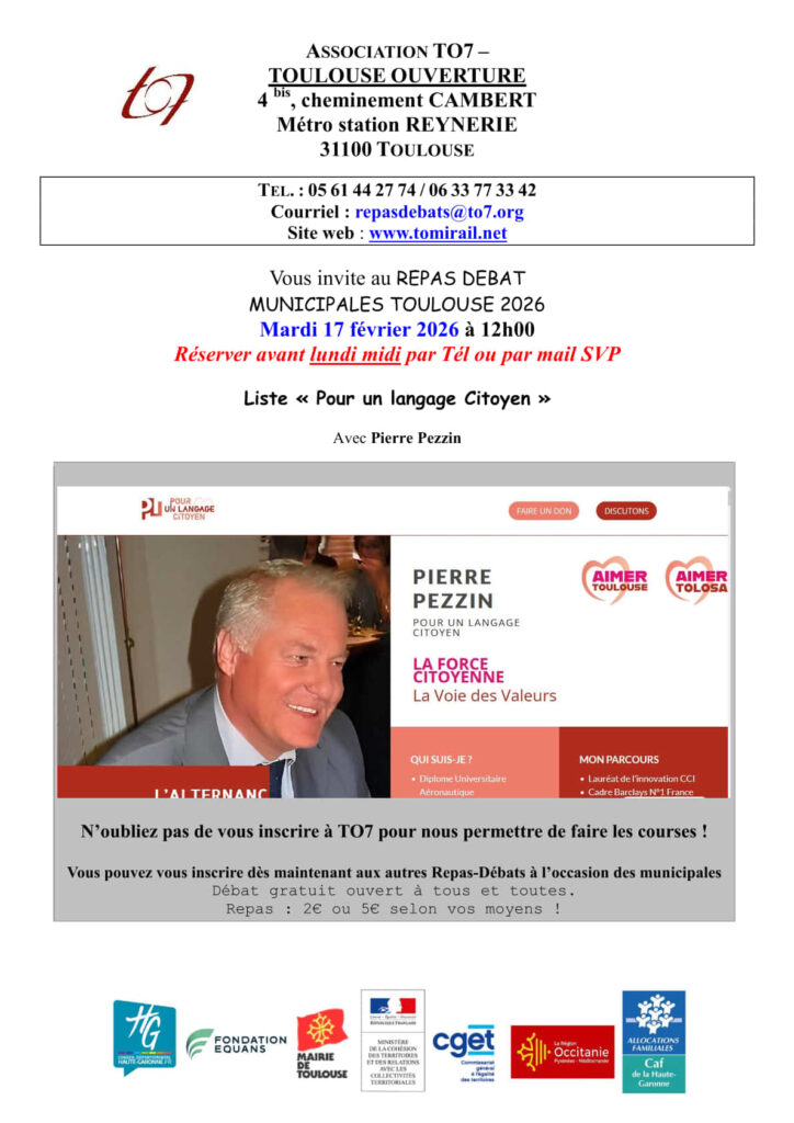 « Tous les Évènements Cet évènement est passé. Repas-débat à TO7 / Municipales Toulouse 2026 17 février – 12h00 – 14h00 TO7 4 bis cheminement Cambert Toulouse, France + Google Map Ajouter au calendrier Google Agenda iCalendar Outlook 365 Outlook Live 2026-02-14