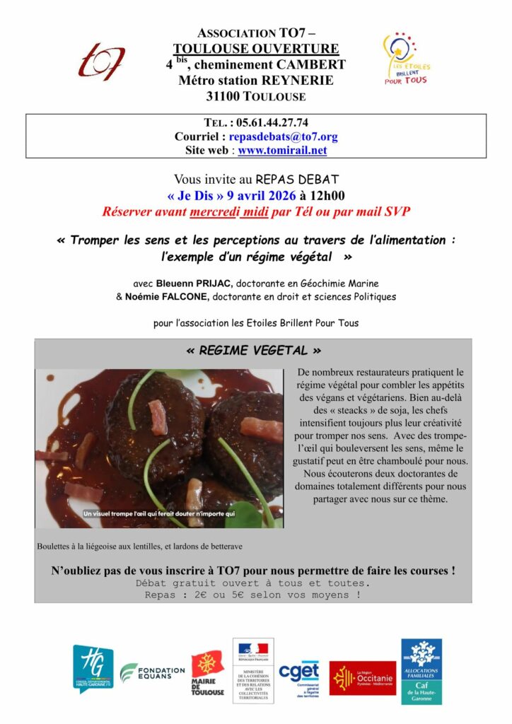 « Tous les Évènements Repas-débat à TO7 / «Tromper les sens et les perceptions au travers de l’alimentation : l’exemple d’un régime végétal» 9 avril – 12h00 – 14h00 TO7 4 bis cheminement Cambert Toulouse, France + Google Map Ajouter au calendrier Google Agenda iCalendar Outlook 365 Outlook Live 2026-04-07