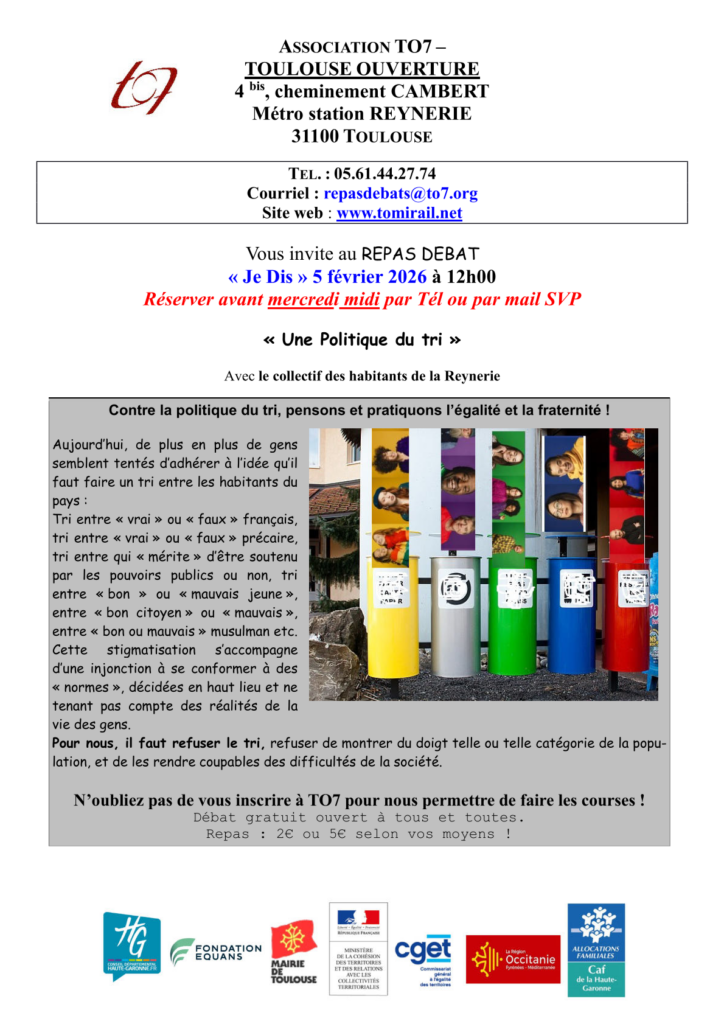 « Tous les Évènements Repas-débat à TO7 / « Une Politique du tri » 5 février – 12h00 – 14h00 TO7 4 bis cheminement Cambert Toulouse, France + Google Map Ajouter au calendrier Google Agenda iCalendar Outlook 365 Outlook Live 2026-02-03
