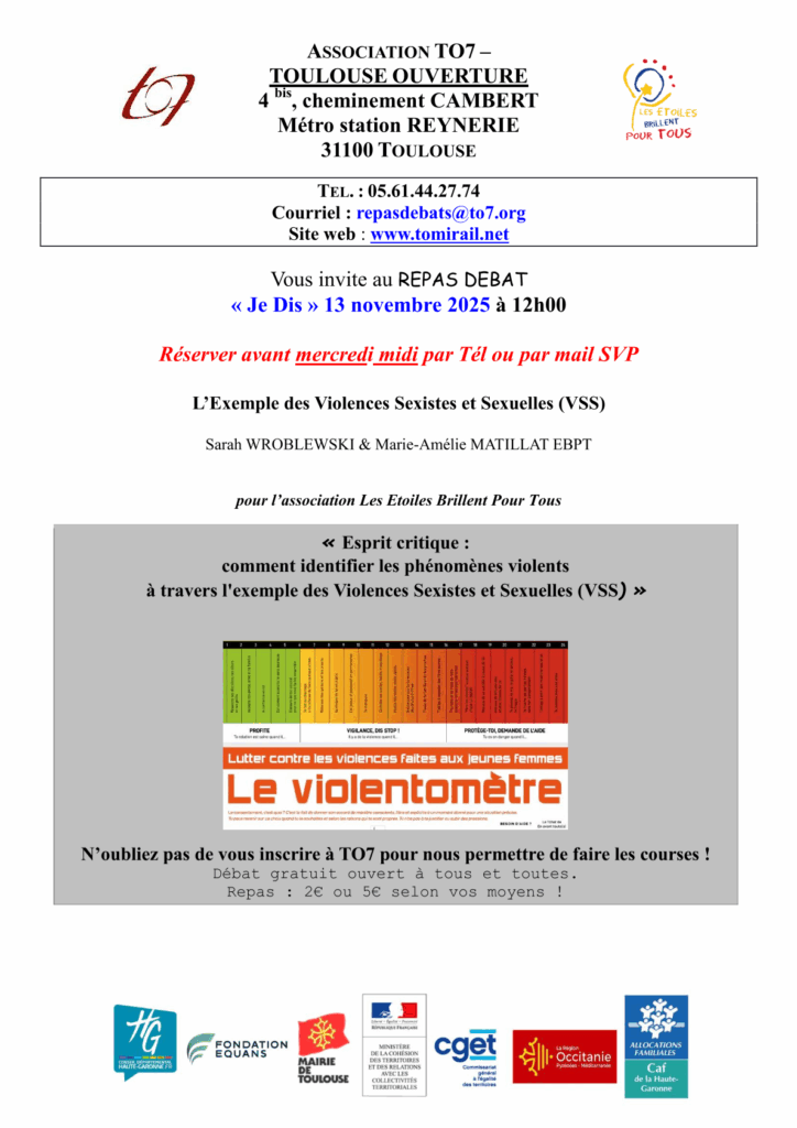 « Tous les Évènements Cet évènement est passé. Repas-débat / L’Exemple des Violences Sexistes et Sexuelles 13 novembre – 12h00 – 14h00 TO7 4 bis cheminement Cambert Toulouse, France + Google Map Ajouter au calendrier Google Agenda iCalendar Outlook 365 Outlook Live 2025-11-10