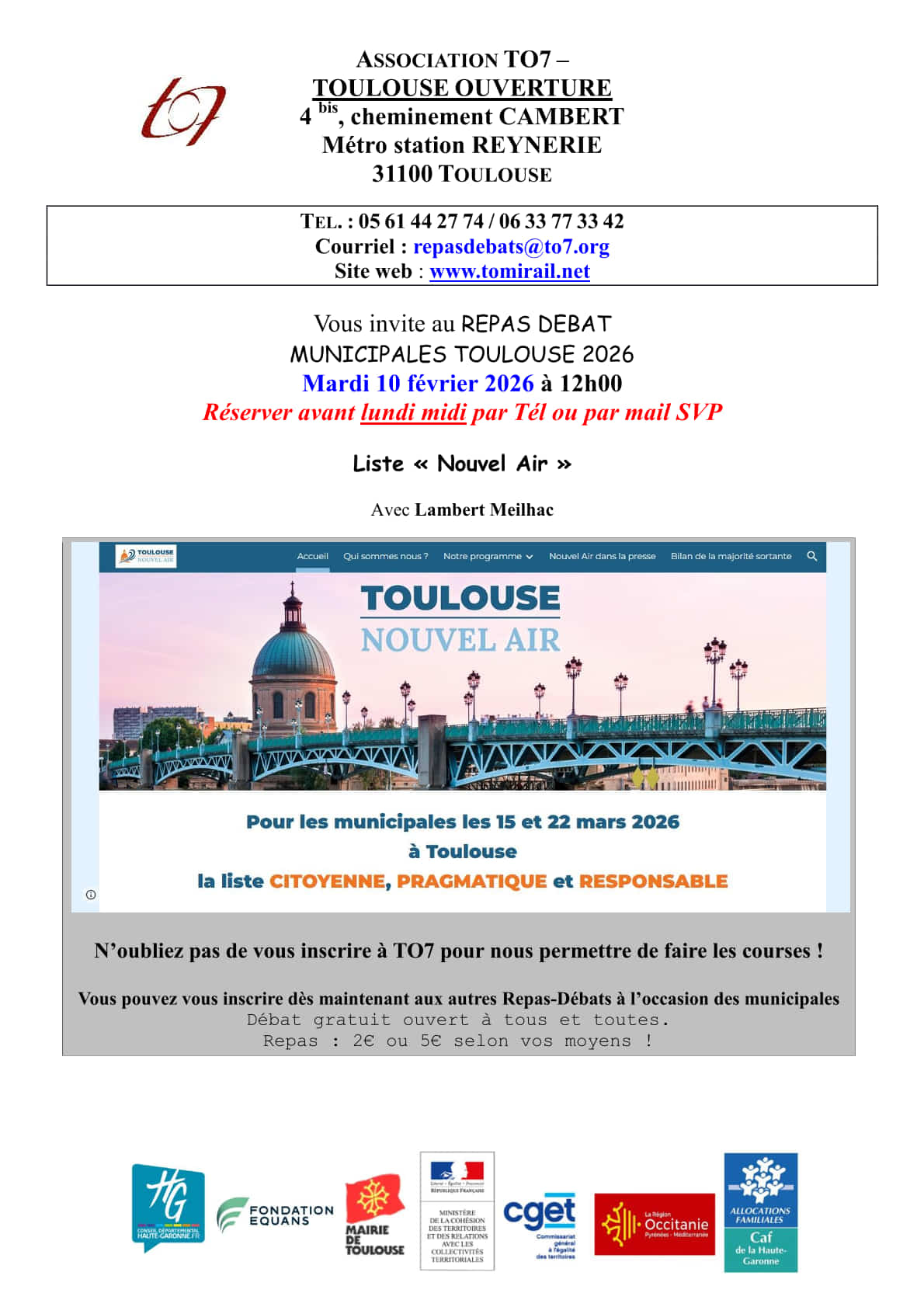 TO7 4 bis cheminement Cambert, Toulouse, FranceRue Oum Kalthoum, 31100 Toulouse Métro station REYNERIE Tél. : 05.61.44.27.74Courriel : repasdebats@to7.org Site web : www.tomirail.net Vous invite au REPAS DÉBAT « Je Dis » 12 février 2026 à 12h00 Réserver avant mercredi