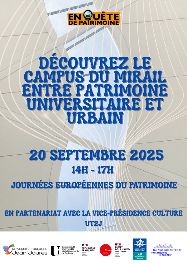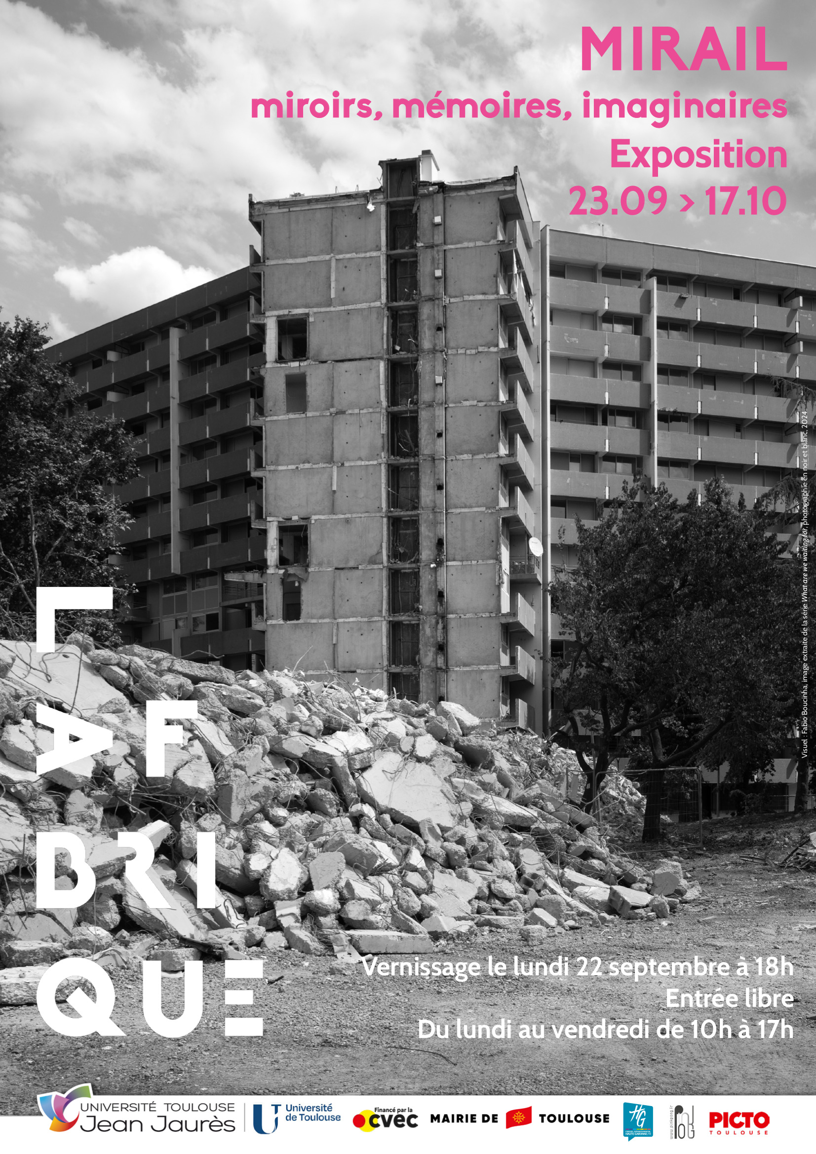 Emmanuelle GarnierPrésidente de l’Université Toulouse – Jean Jaurèsa le plaisir de vous inviter au vernissage de l’exposition MIRAILmiroirs, mémoires, imaginaires Avec :Leila Bakouche, Eva Bauer, Fabio Boucinha et Xavier Ovidio, |