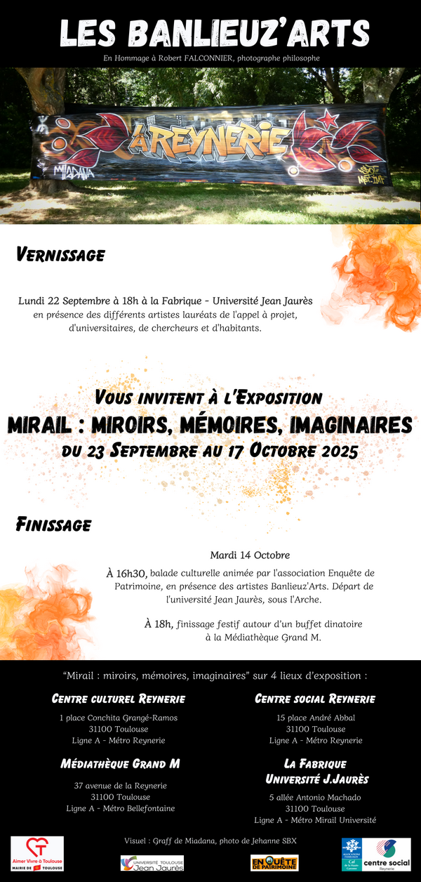MIRAIL, miroirs, mémoires, imaginaires Mardi 14 OctobreA 16h30, balade culturelle animée par l'association Enquête de Patrimoine, en présence des artistes Banlieuz'Arts. Départ de l'université Jean Jaurès, sous l'Arche.A 18h, finissage |