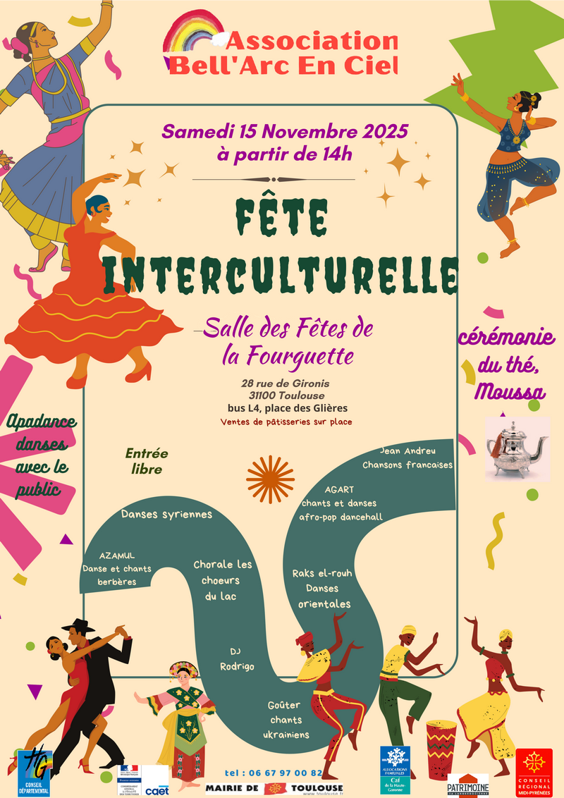 L'association "Bell'Arc en Ciel" a le plaisir de vous convier à une fête interculturelle qui se déroulera le samedi 15 novembre de 14h à 18h. |