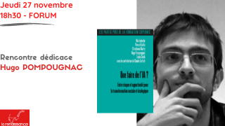 Hugo POMPOUGNAC vient présenter le livre QUE FAIRE DE L’IA ? aux éditions Le Croquant auquel il a collaboré. Doit-on craindre l’IA ou peut-elle être un instrument au service de la |