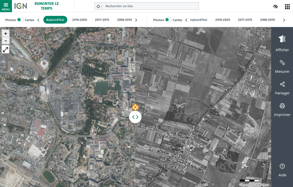 Pour apprécier une dynamique, ou comprendre une évolution, rien ne vaut de pouvoir comparer l’avant et l’après. C’est ce que propose l’I.G.N. (Institut national de l’information géographique et forestière) avec des cartes affichées de part et d’autre de notre écran, qui nous permettent, aisément, de pouvoir comparer l’état actuel de notre quartier avec son passé :