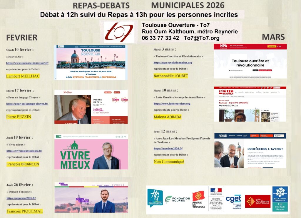 A l’occasion des élections municipales et à la demande de notre public, nous avons programmé une série de Repas-Débats les mardis et/ou jeudis de 12h00 à 14h00 avec les listes qui se présentent.